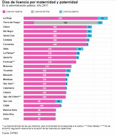 Las familias cubiertas acceden a distintos tipos de licencia según el sector y la provincia en la que trabajen. Once provincias otorgan a los padres hasta 5 días de licencia: Chubut (2), Entre Ríos (2), Jujuy (2), Misiones (2), Buenos Aires (3), Catamarca (3), CABA (3), Formosa (4), Corrientes (5), Mendoza (5) y San Juan (5). En Córdoba y Santa Fe los padres pueden tomarse 8 días y 10 días para La Pampa y Neuquén. Chaco, Río Negro, Santa Cruz y Tucumán otorgan a los padres 15 días corridos de licencia y en Salta y San Luis es de 20 días. Los empleados públicos de La Rioja llegan a 30 días.