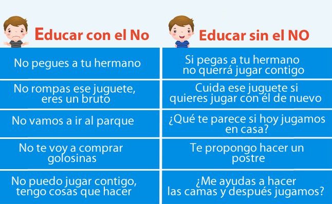 Si empleamos el NO constantemente como: no puedo jugar contigo, no puedes ir al parque, no cojas la tablet o no pegues a tu hermano; el mensaje es negativo y además estamos abusando del NO y con ello corremos el riesgo de que no nos hagan caso.