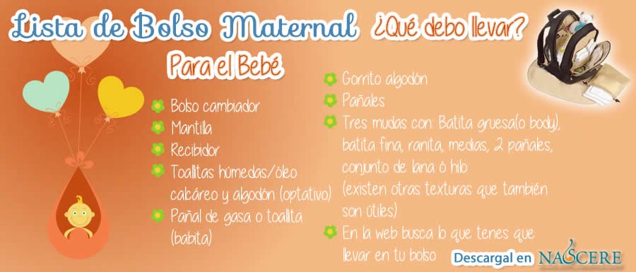 Bebé Bolso cambiador Mantilla Recibidor Toallitas húmedas/óleo calcáreo y algodón (optativo) Pañal de gasa o toallita (babita) Gorrito algodón Pañales *Tres mudas con: Batita