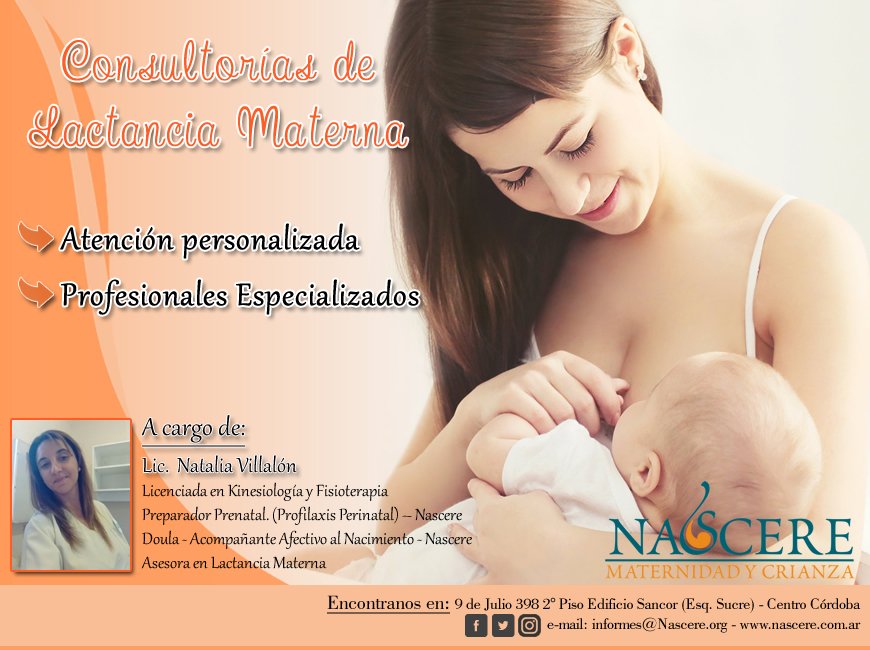 Consultorías de lactancia en Nascere Para aquellas mamás que necesiten una atención personalizada, contamos con consultorías en lactancia en nuestra institución. Sólo es necesario